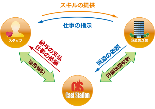 人材派遣とは、派遣会社(派遣元)・派遣スタッフ・派遣先企業(派遣先)の三者で成り立っています。